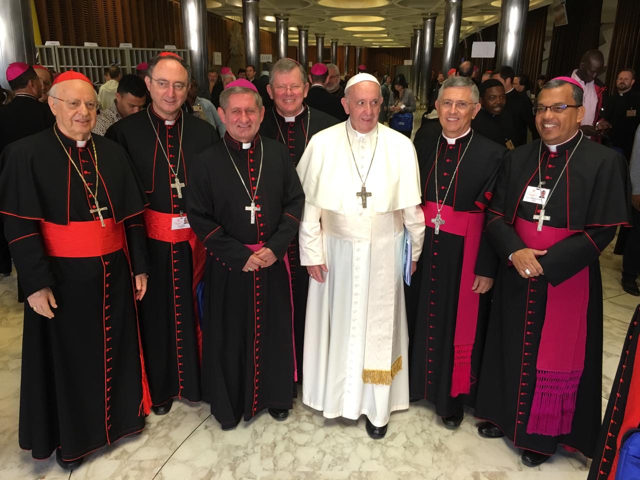 Papa Francisco acolhe delegação de bispos brasileiros na chegada à Sala do Sínodo