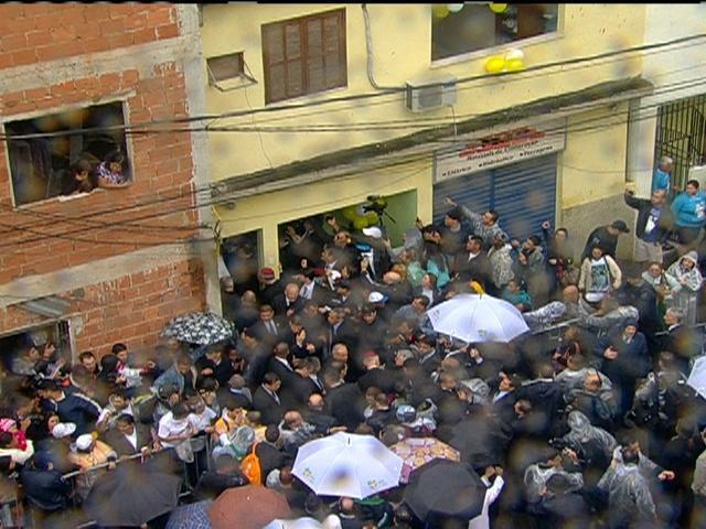 Em Varginha, região de um complexo de Favelas no Rio de Janeiro, o Papa Francisco fez um discurso contundente na manhã desta quinta-feira, 25 de julho. Ele pediu: “Não se cansem de trabalhar por um mundo mais justo e mais solidário! Ninguém pode permanecer insensível às desigualdades que ainda existem no mundo!”. Na oportunidade, o Papa também visitou a casa de uma família (foto abaixo), escolhida no momento em que ele passava pelo local. O Santo Padre entrou e conversou por alguns minutos com os moradores. Nas ruas, distribui beijos e abraços às crianças, jovens e adultos.