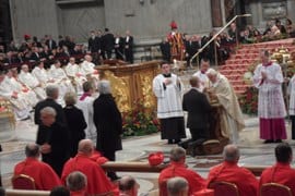 Os novos Cardeais foram concelebrantes, portanto, ocuparam os mesmos lugares que estiveram no Consistório, isto é, diante do altar e sentados num semicírculo. Em nome do grupo, antes da liturgia, falou o Cardeal Fernando Filoni. O papa deixou o veículo que o conduzira desde a entrada da Basílica e se sentou diante do altar-mor que se encontro sobre o túmulo do Apóstolo Pedro. Em latim, ele presidiu a Eucaristia na solenidade da Cátedra de São Pedro. A primeira leitura, tirada do livro do profeta Ezequial foi lida em inglês. Retirada da primeira Carta de São Pedro, a segunda leitura foi feita em espanhol. O trecho do Evangelho de São Mateus foi proclamado em latim.