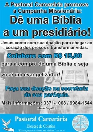 Com o dinheiro arrecadado, serão comprados os modelos de Bíblia que atendem às normas de segurança dos presídios. Para contribuir com essa campanha, entre em contato com a secretaria de qualquer paróquia da Área BR-101 Norte ou com os agentes da Pastoral Carcerária.