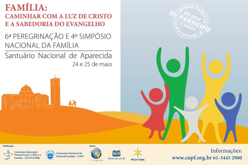 Com o tema “Família: caminhar com a luz de Cristo e a sabedoria do Evangelho”, acontecerão a 6ª Peregrinação Nacional da Família e o 4º Simpósio, nos dias 24 e 25 de maio, em Aparecida (SP). O evento pretende reunir peregrinos de todo o país com a proposta de refletir sobre a realidade da família brasileira. Em 2013, participaram da peregrinação mais de 150 mil pessoas. A expectativa da organização é superar esse número na edição deste ano.