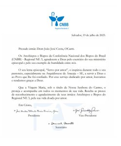 Presidência do Regional Nordeste 3 envia mensagem a Dom João José Costa, cuja renúncia foi aceita pelo Papa