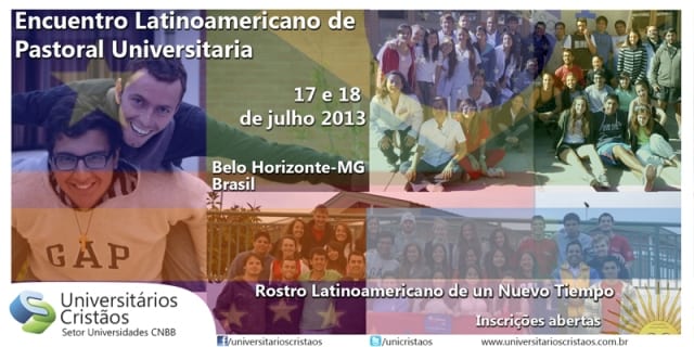As inscrições para o II Encontro Latino-americano de Pastoral Universitária foram prorrogadas, até o dia 11 de julho. O evento será na Pontifícia Universidade Católica de Minas Gerais (PUC MINAS), de 18 e 21 de julho, durante a Semana Missionária, dentro Congresso Mundial de Universidades Católicas (CMUC). As inscrições para o II Encontro Latino-americano de Pastoral Universitária são gratuitas e podem ser realizadas no blog do evento ou pela site www.universitarioscristaos.com.br. Para participar do CMUC os interessados devem acessar o site www.cmuc.pucminas.br