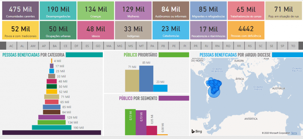 O gráfico abaixo mostra o alcance da solidariedade da Igreja no Brasil neste tempo de pandemia. 475 mil comunidades carentes foram beneficiárias da ação emergencial solidária “É Tempo de Cuidar”. Entre os beneficiados, 190 mil desempregados, 71 mil pessoas em situação de rua, 33 mil indígenas, 52 mil povos e comunidades tradicionais, entre outros.