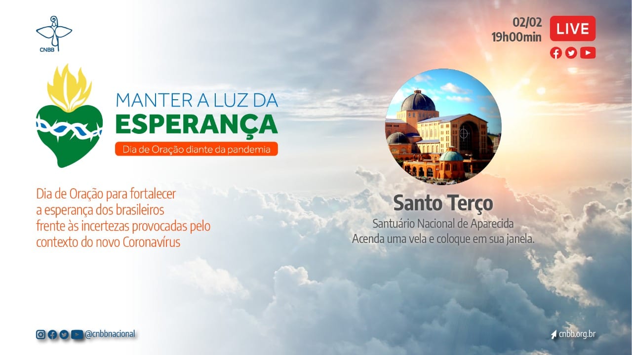 Acompanhe ao vivo o Terço, direto do Santuário Nacional de Nossa Senhora Aparecida, durante este Dia de Oração diante da pandemia promovido pela Conferência Nacional dos Bispos do Brasil (CNBB). Para este terço, a CNBB pede que em cada casa seja, dentro do possível, colocada uma vela acesa em uma das janelas, de modo que, ainda que pequena, a luz irradie para as outras pessoas.