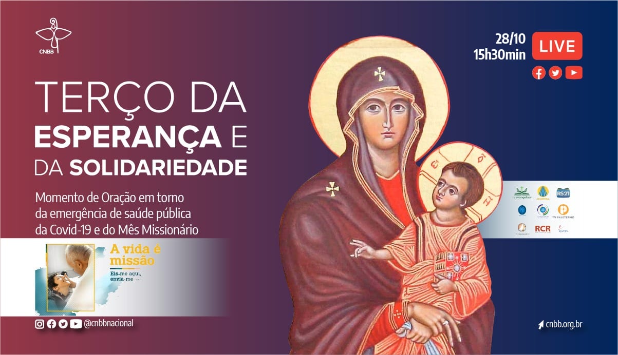 Nesta quarta-feira, 28 de outubro, às 15h30, reze com a Igreja no Brasil o Terço da Esperança e da Solidariedade em prol do mês missionário, exibido diretamente do altar central do Santuário Nacional de Aparecida. O Terço foi produzido e gravado nos estúdios da TV Aparecida (SP) e será transmitido, às 15h30, pelas emissoras de TV e rádio de inspiração católica do país e retransmitido simultaneamente pelas redes sociais da CNBB, Facebook, YouTube e Twitter.