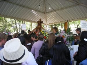 Na caminhada até o seminário São João Batista os romeiros cantaram, rezaram e manifestaram-se pela paz com bandeiras e lenços brancos.
