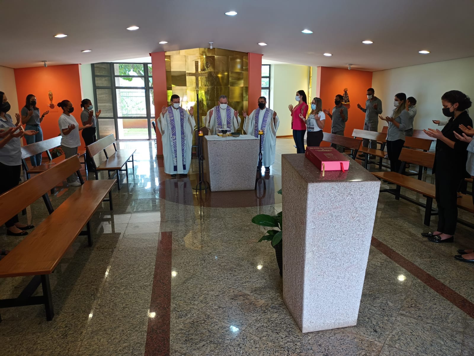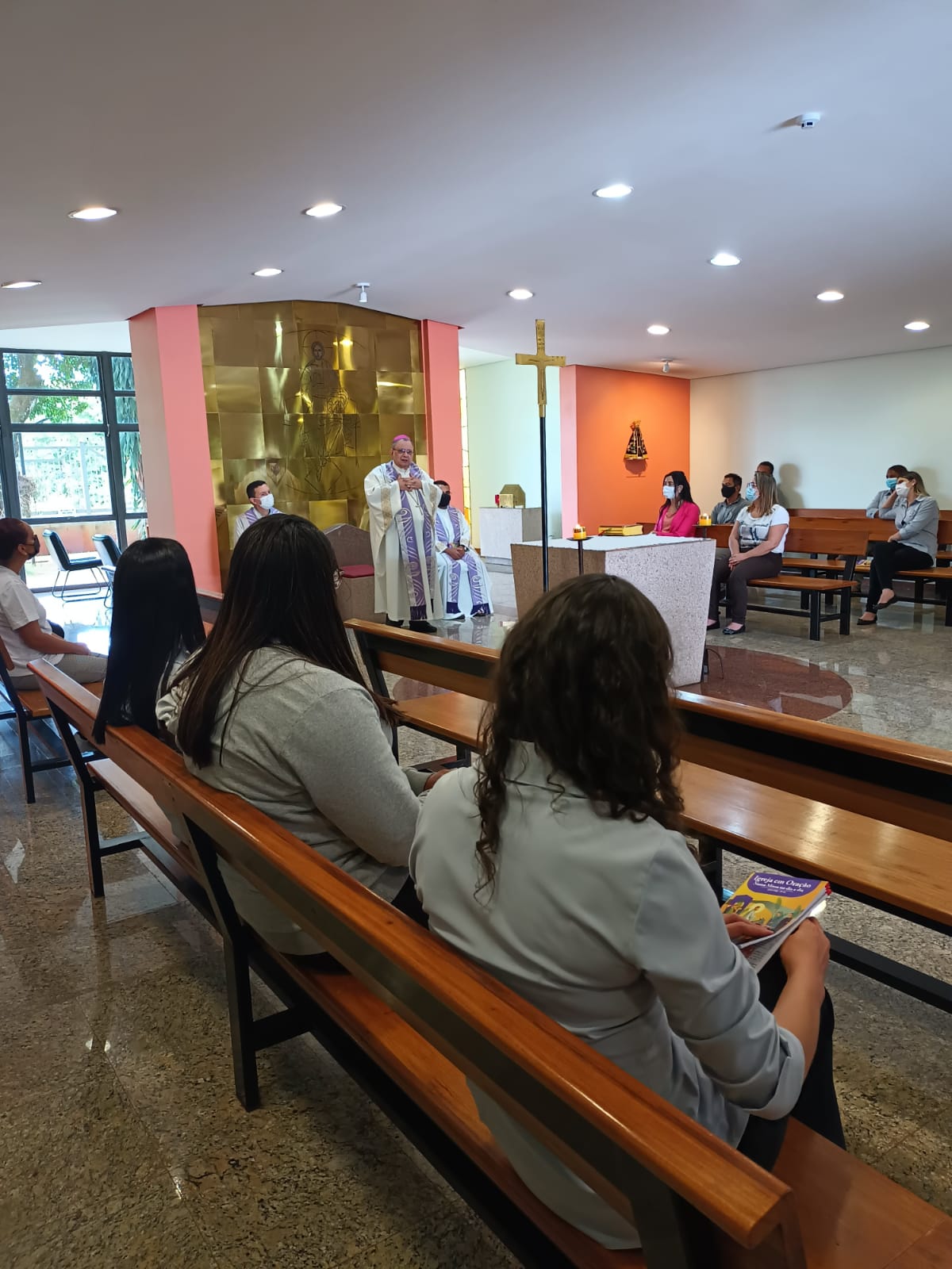 Na manhã desta sexta-feira, 18 de março, dom Joel Portella, secretário geral da CNBB, presidiu celebração eucarística na Capela Nossa Senhora Aparecida, na sede da entidade, em Brasília (DF). A missa quaresmal foi concelebrada pelos padres Patriky Samuel Batista, secretário-executivo de Campanhas da CNBB, e Crispim Guimarães dos Santos, assessor da Comissão para a Vida e a Família da CNBB.