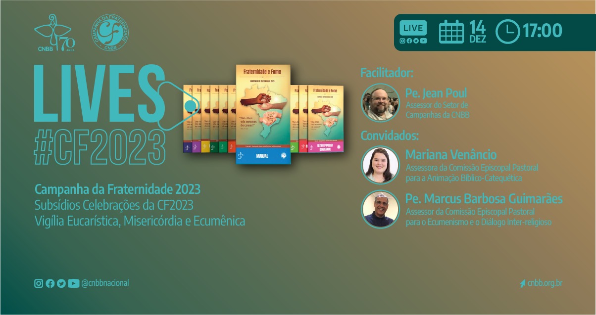 O Setor de Campanhas da Conferência Nacional dos Bispos do Brasil (CNBB) promove, na quarta-feira (14/12), das 17h às 17h30, a segunda live da série “Lives#CF2023” que tem como objetivo divulgar os subsídios específicos da Campanha da Fraternidade (CF) 2023, com os organizadores e autores das publicações. A iniciativa poderá ser acompanhada nas redes sociais da CNBB e da Edições CNBB.