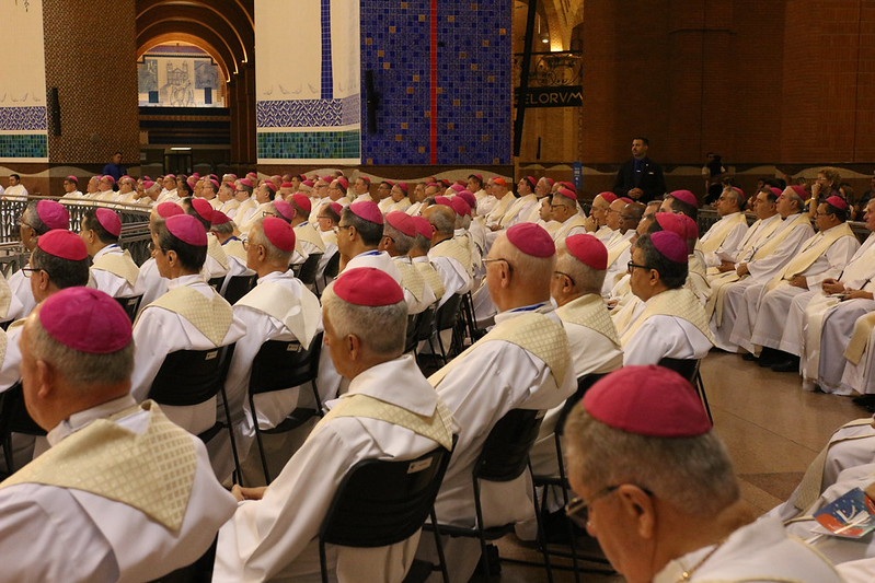No início da noite desta sexta-feira, 17 de abril, o Santuário Nacional de Aparecida acolheu o episcopado brasileiro reunido na 62ª Assembleia Geral da CNBB para a Celebração da Eucaristia com Vésperas. A liturgia foi presidida por dom Leomar Antônio Brustolin, arcebispo da arquidiocese de Santa Maria (RS) e presidente da Comissão Episcopal para a Animação Bíblico-catequética. Dom Leomar é o coordenador do tema central da Assembleia (Diretrizes Gerais da Ação Evangelizadora da Igreja no Brasil) que também foi colocado no altar do Senhor na Eucaristia.