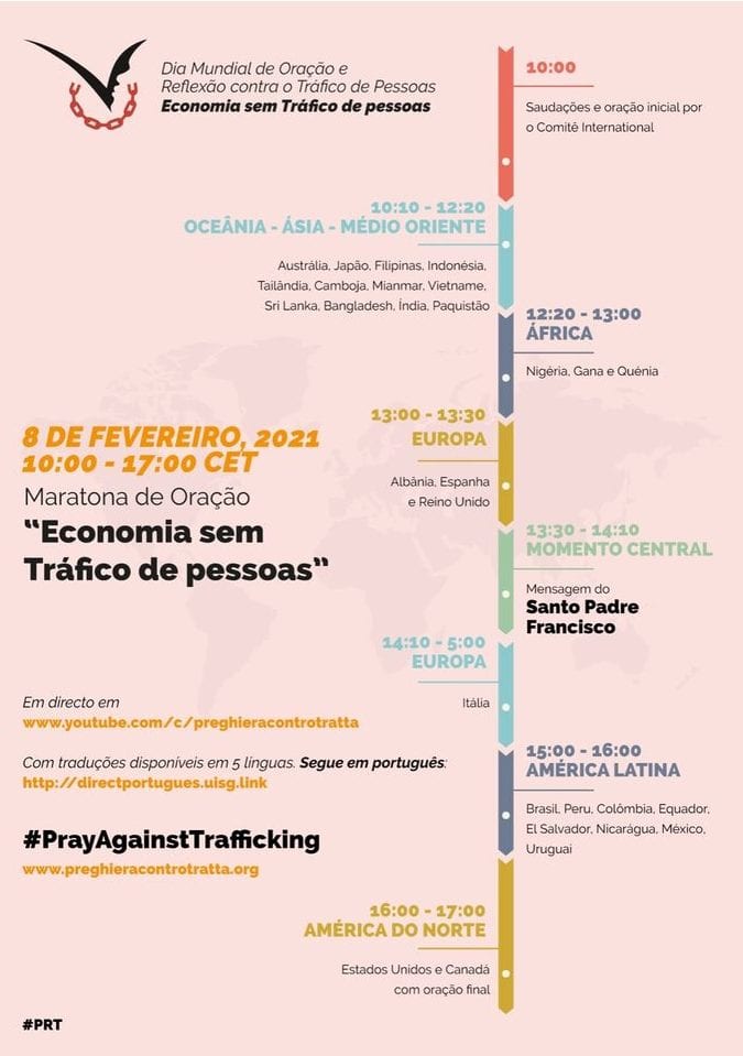 Na sétima edição, e em plena pandemia, a Maratona de Oração será on-line, das 10 às 17 horas, em transmissão ao vivo no canal do YouTube do Dia Mundial, com traduções em cinco idiomas, incluindo o português, e irá cruzar as diferentes áreas do planeta para acender os refletores e sensibilizar a opinião pública sobre uma das principais causas do tráfico de pessoas, isto é, o modelo econômico dominante.