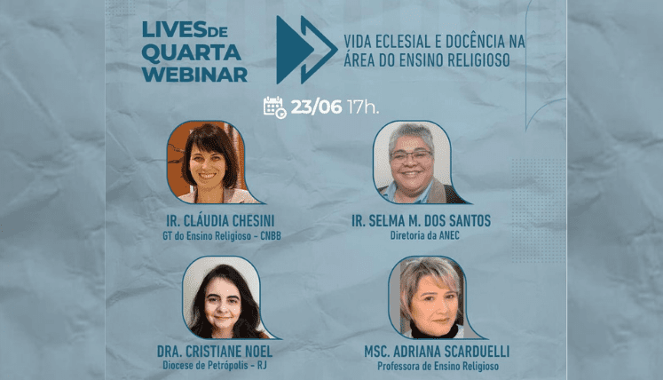 A Comissão Episcopal Pastoral para Cultura e Educação da Conferência Nacional dos Bispos do Brasil (CNBB) em parceria com a Sociedade Brasileira de Cientistas Católicos (SBCC), realizam, nesta quarta-feira, 23 de junho, às 17h, o webinar com a temática: ‘Vida Eclesial e Docência na Área do Ensino Religioso’.