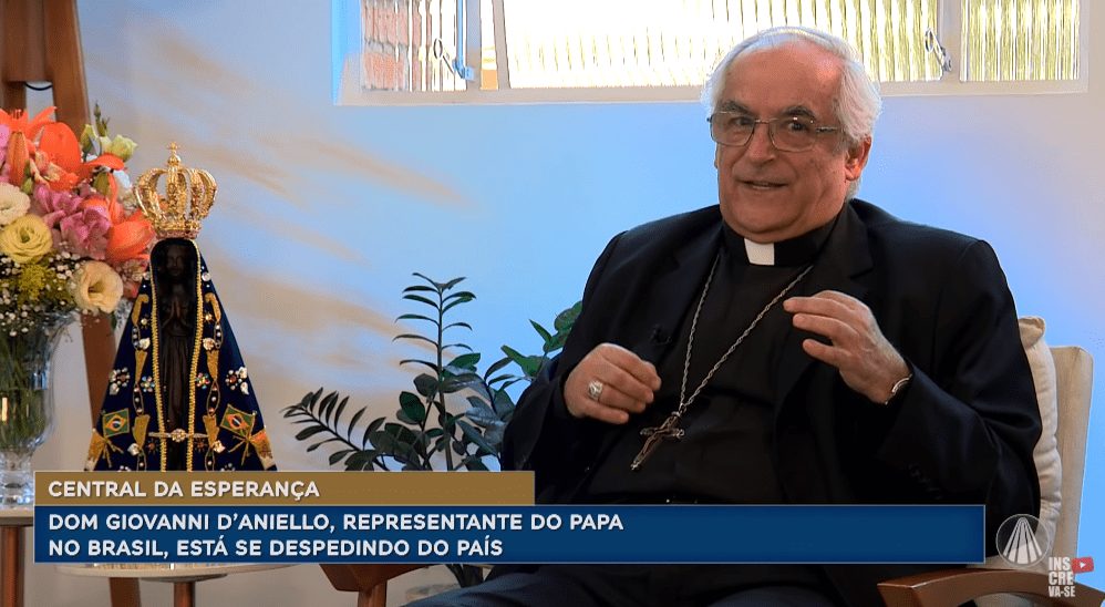 O núncio apostólico no Brasil, dom Giovanni D’Aniello, se despede do país após oito anos e meio à frente do serviço diplomático da Santa Sé no Brasil. Para marcar a despedida, dom Giovanni presidiu uma missa no Santuário Nacional de Nossa Senhora Aparecida, em Aparecida (SP), na manhã de quinta-feira, 23 de julho, e concedeu entrevista à TV Aparecida, conduzida pela jornalista Camila Morais, que foi ao ar no programa Central da Esperança.